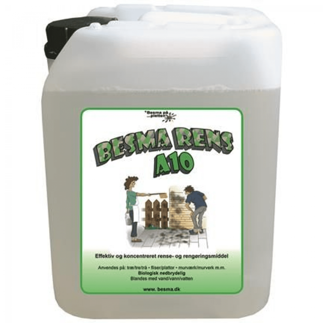 Besma RensA10 blandes med koldt vand før rensning. Kan anvendes med børste, spray eller lavtryksrenser. Behandlingen skal foregå i tørvejr, og produktet skal ikke skylles af igen. Temperaturen bør være over 10 C. Undgå at afrense på en varm / ophedet flade og letmetaller, idet sæben kan brænde fast.